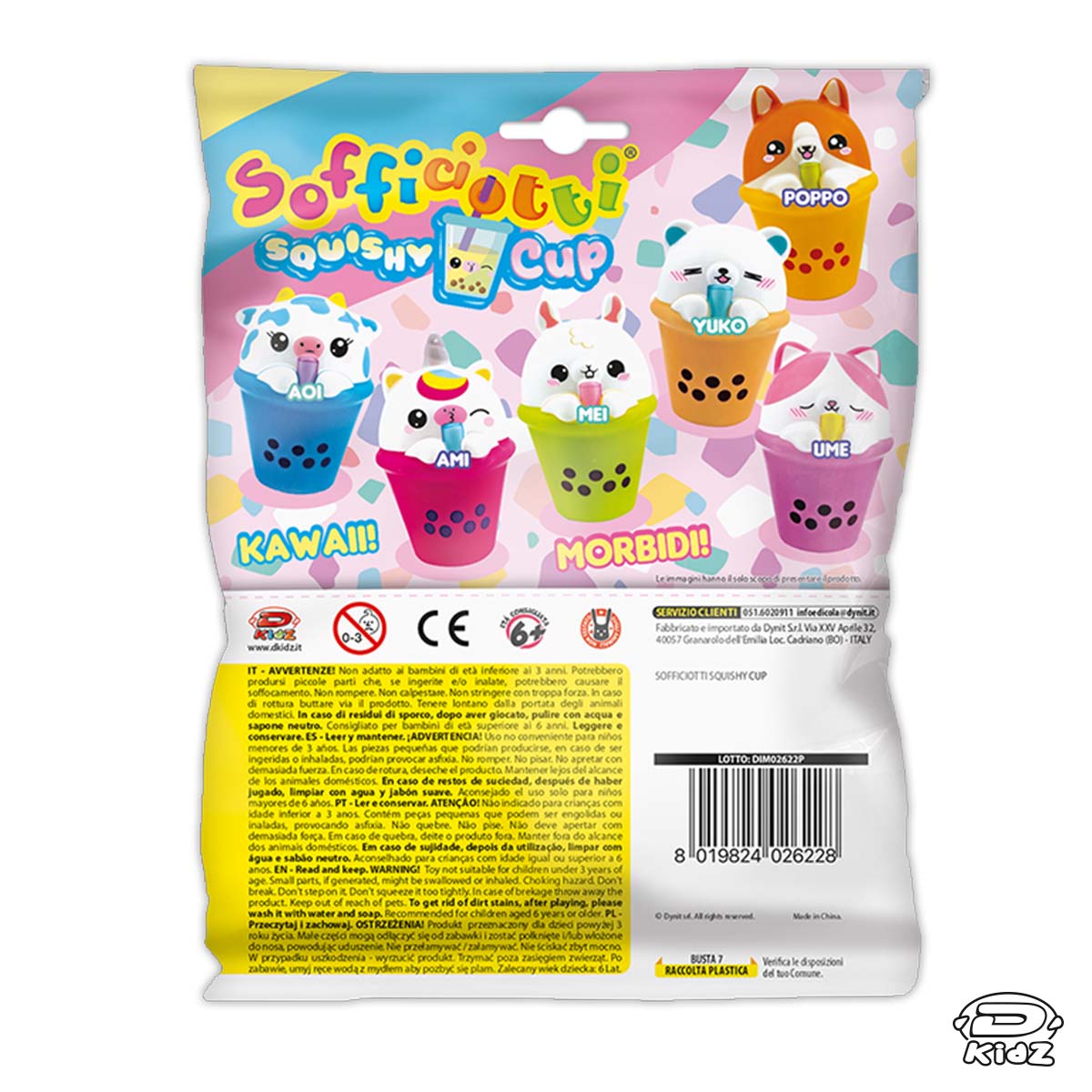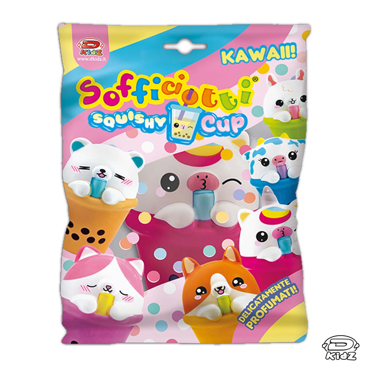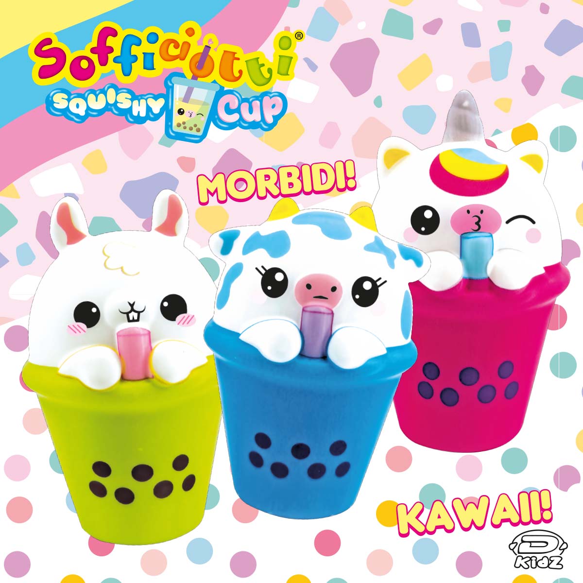 I Sofficiotti tornano in una dolcissima versione milk-shake! I 6 personaggi – orso, topo, coniglio, unicorno, gatto, cane e mucca – sono immersi in colorate tazze di milk-shake, tutti realizzati in materiale squishy, perfetti come antistress e per momenti ASMR.