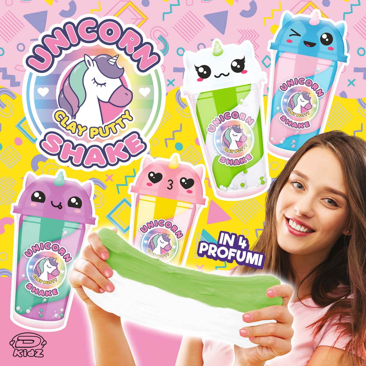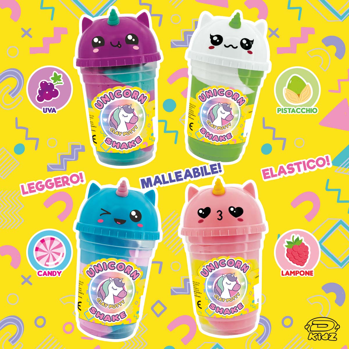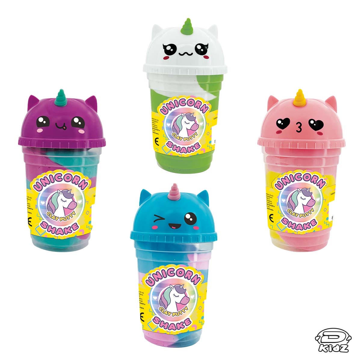 Quattro irresistibili confezioni di morbido clay bicolore, profumato e tutto da modellare. Ogni barattolo è sormontato da un coperchio a forma di unicorno, completo di corno, che rende il prodotto ancora più incantevole e da collezionare, perfetto per attirare l’attenzione con i suoi colori vivaci e le sue profumazioni golose.